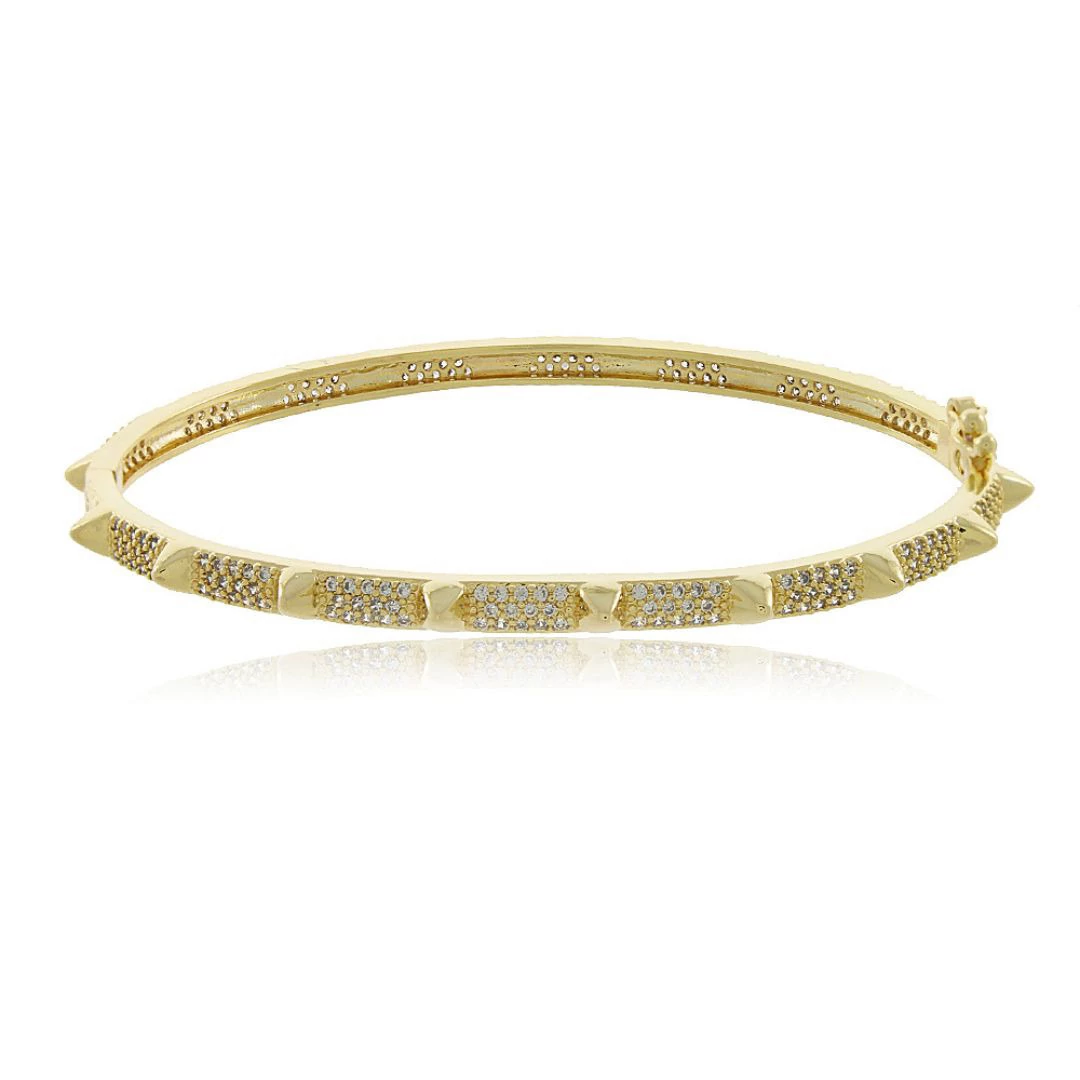 Bracelete cravejado em microzircônias e detalhes de spikes, com banho de ouro 18K e finalização em verniz Diamond.