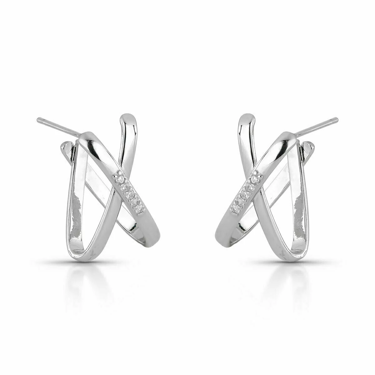 Brinco em formato de X, cravejado com microzirconias no cristal, Banhado no Ródio Branco e acabamento em verniz.